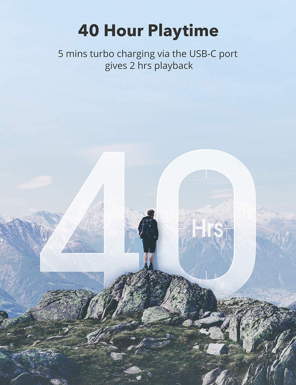 - 40H Playtime & Incredible Fast Charging: Plug in for only 5 minutes with a USB-C connector and get 2 hours playback; only 45 minutes charging time for an ultra-long playtime up to 40 hours. Note: Turn off ANC to avoid power consumption if headphones are not in use.