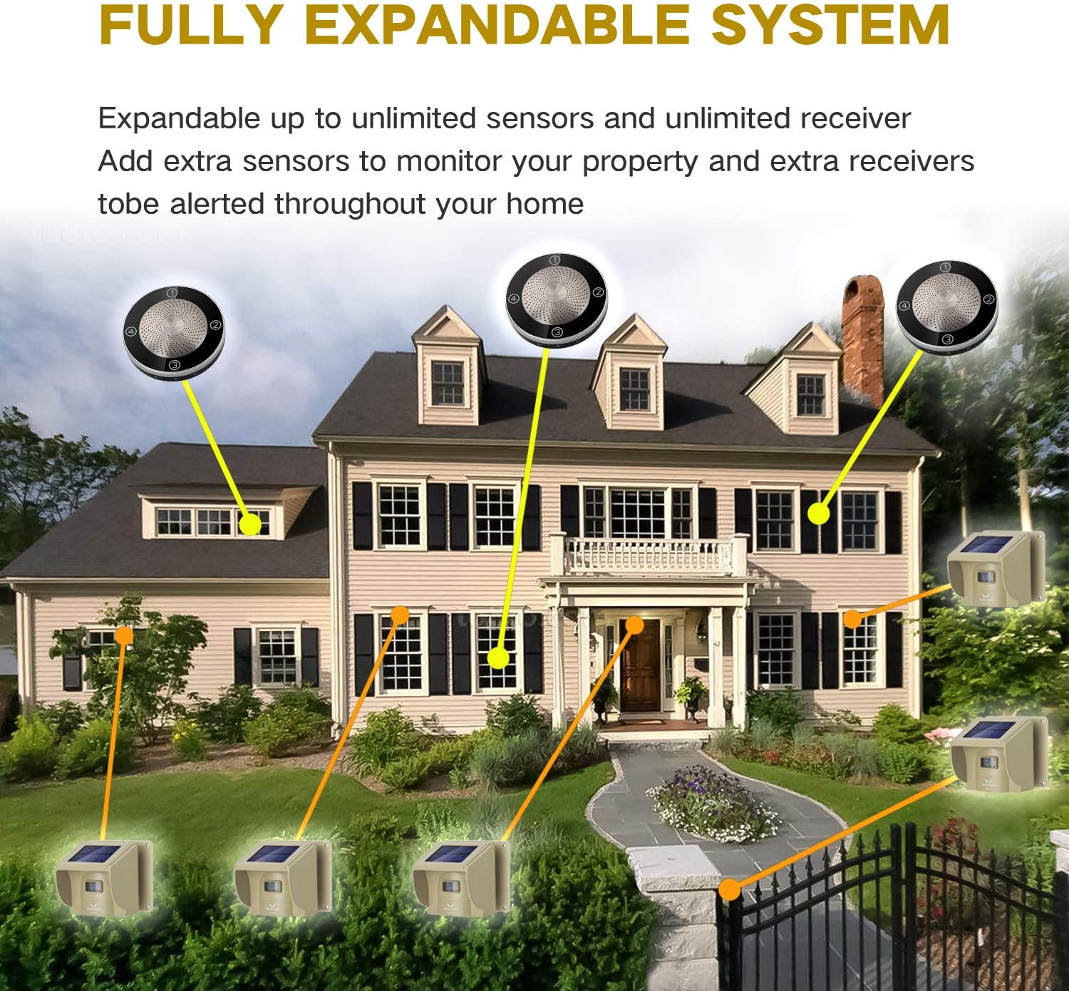 - EASY TO INSTALL- Quick Start Guide has you operational in minutes! Can expandable up to 4 sensors and unlimited receivers for complete coverage of your perimeter. wireless driveway alarm Detects movement from humans, cars, and large animals.Over 4 fun & unique chimes to choose from. Match different chimes with different sensors around your property to differentiate where driveway alarm wireless motion is being detected.